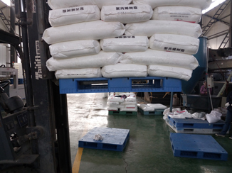 上圖為:托盤載重1500kg塑料原料側(cè)面舉升狀態(tài),塑料托盤沒有彎曲前傾現(xiàn)象
